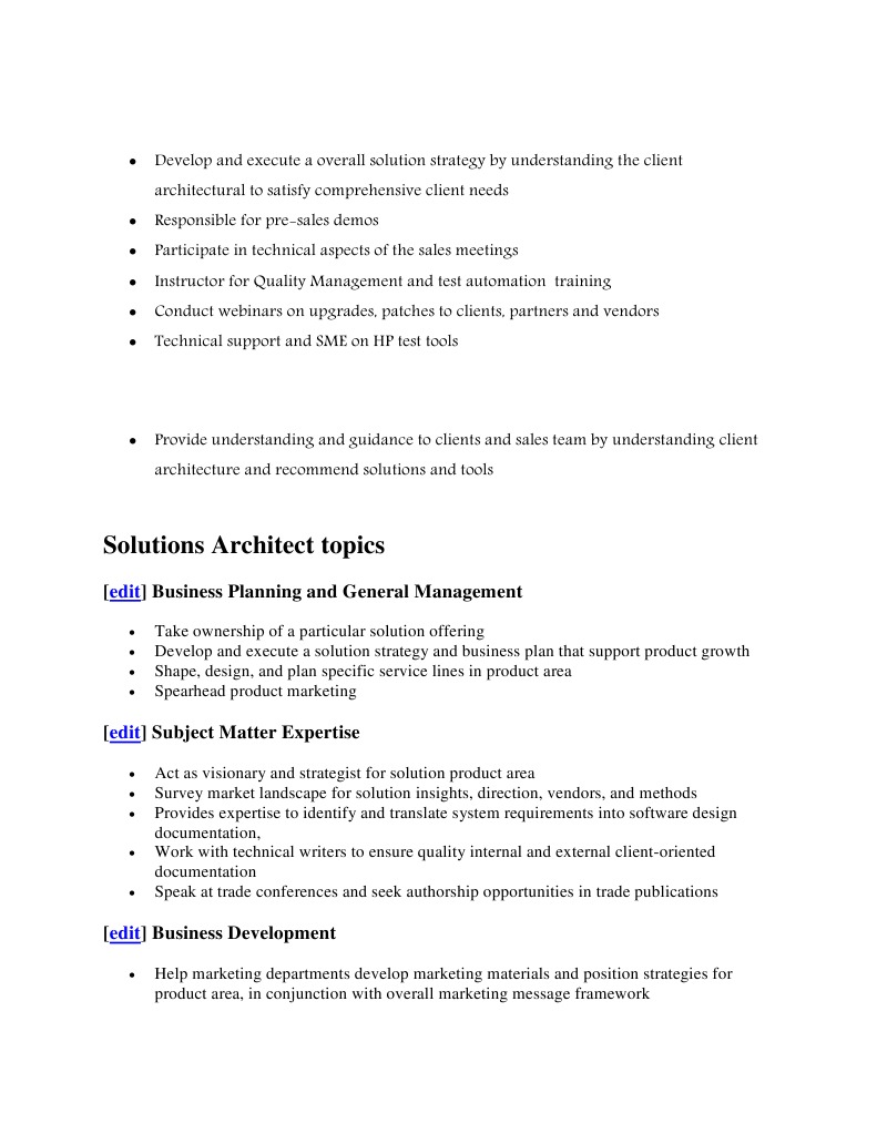 Solution Architect - Job Description BPXnet | Architect ... from imgv2-1-f.scribdassets.com To work with stakeholders to specify, design and select information systems that deliver great value to the organisation. The architect plays an integral role in building a holistic view and roadmap of the company. We are looking for a creative and inspired architect to handle projects from the initial client briefing through to the final stages of construction.